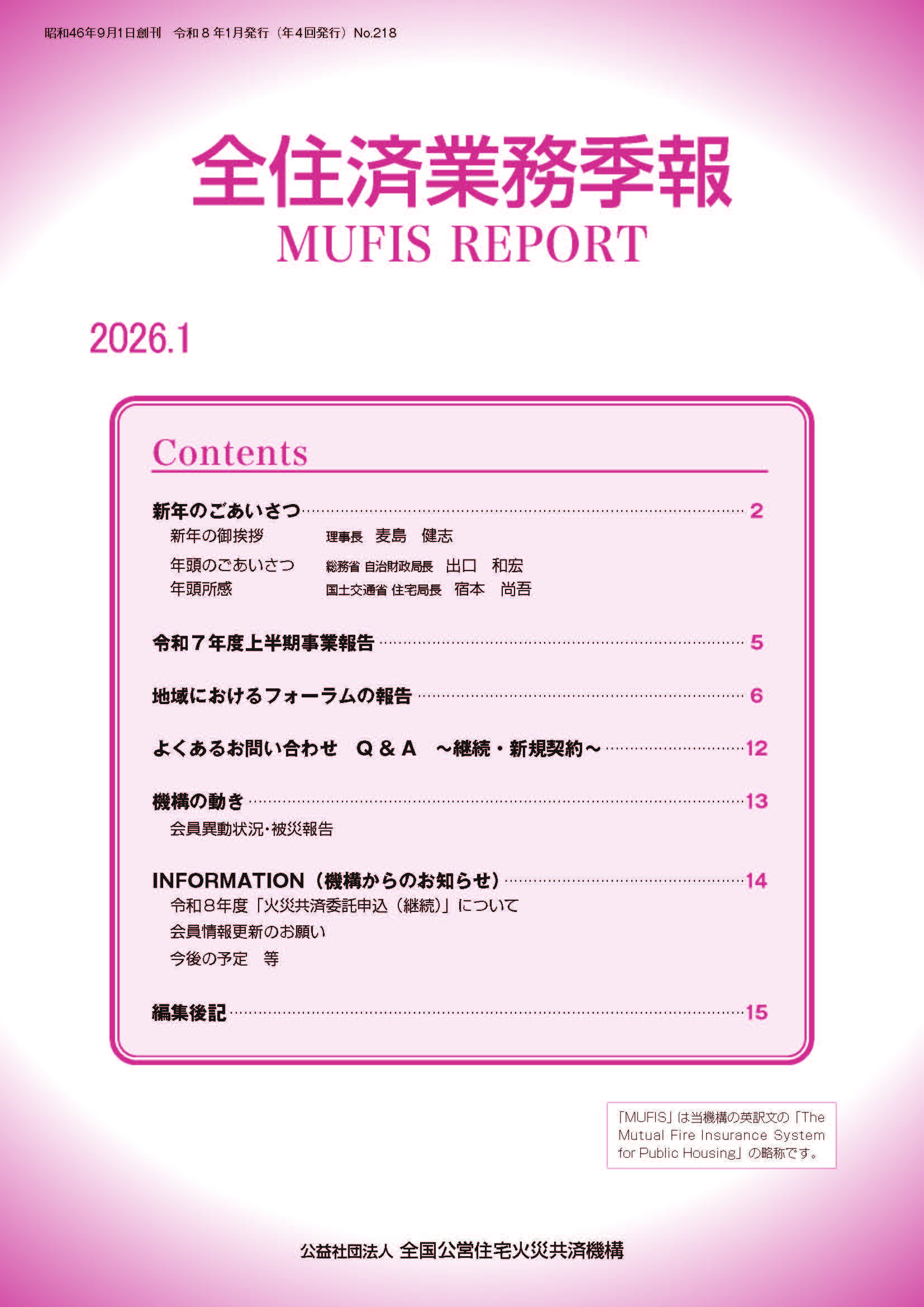 本機関誌は、当機構の事業実績や会員の皆様へのお知らせのほか、中央省庁情報として「公営住宅施策」や「住宅火災」等に関する記事を、また、会員地方公共団体を中心とした各地における公営住宅に係る取組事例などを掲載しています。